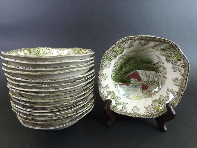 LOT 201 - Lot of 16 Johnson Bros. "The Friendly Village - The Covered Bridge" Soup Bowls - Made in England