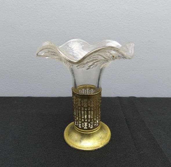 LOT 98 - Vintage Ruffled Edge Trumpet Bud Vase in Metal Caddy