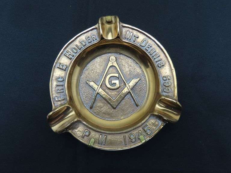 LOT 4 - 1945 Eric E Holder Brass Freemason Masonic Ashtray with Wall Hanger