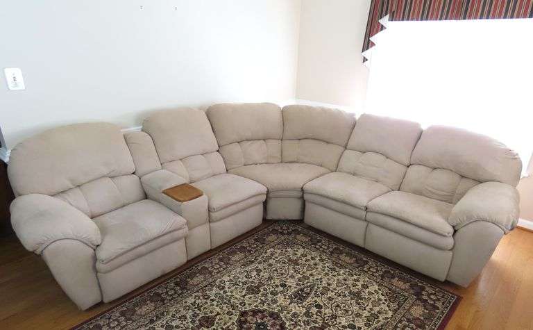 This could use a cleaning but we believe it will come clean. The reclining section on the left measures 65" x 39" x 38". The section on the right measures 57" x 39" x 38". The center section measures 59" x 40" x 38" tall. High bidder is solely responsible for transport.