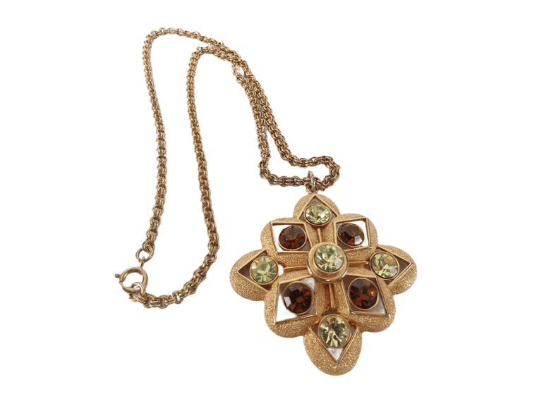 LOT 4 - Gold Tone Sarah Coventry Pendant with Colored Rhinestones on 24" Gold Tone Chain