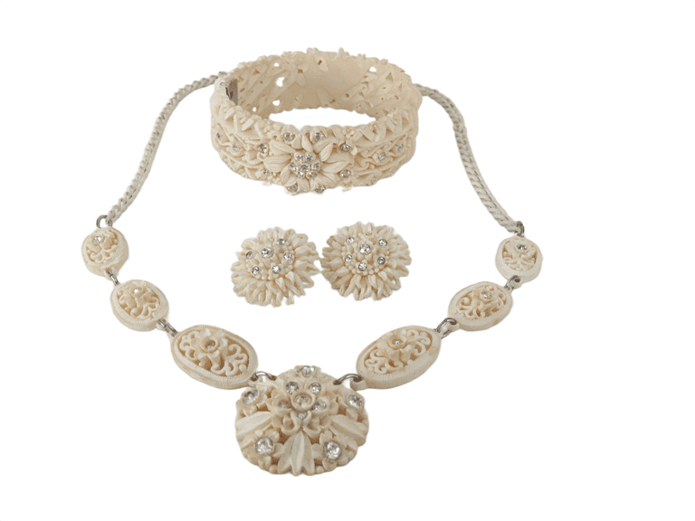 LOT 80 - Beautiful Vintage Cream Carved Celluliod Necklace, Clip Earring and Bracelet Set