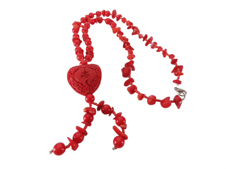LOT 26 - 22" Red Beaded Necklace w/ Cinnabar Heart Pendant