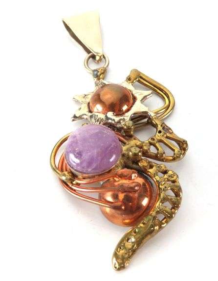 LOT 225 - Artisan Brass & Copper Brooch with Polished Stone